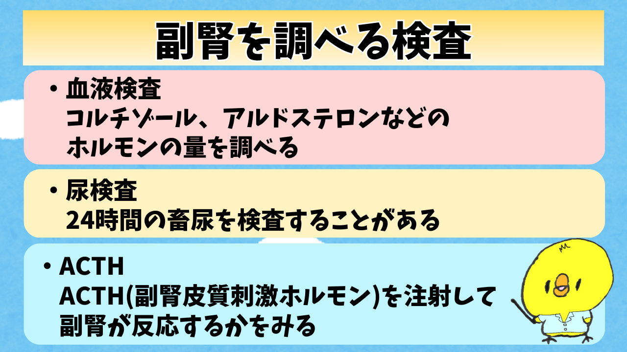 だから異常があると体に大きな影響が出るから血液や尿検査、刺激試験、画像検査などを使ってしっかり調べるんだよ。