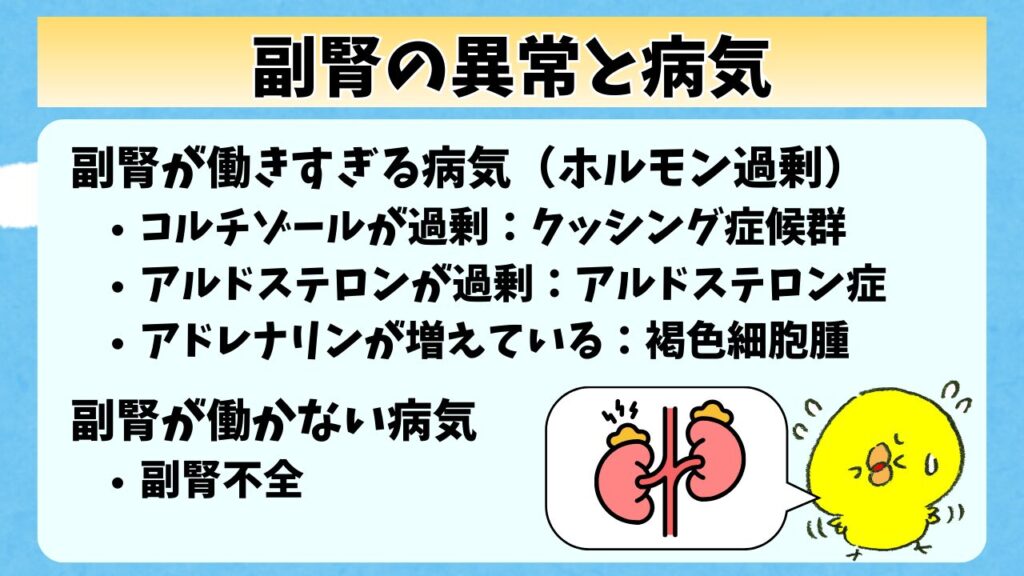 逆に副腎がうまく働かない病気としては、副腎の機能不全になるね。