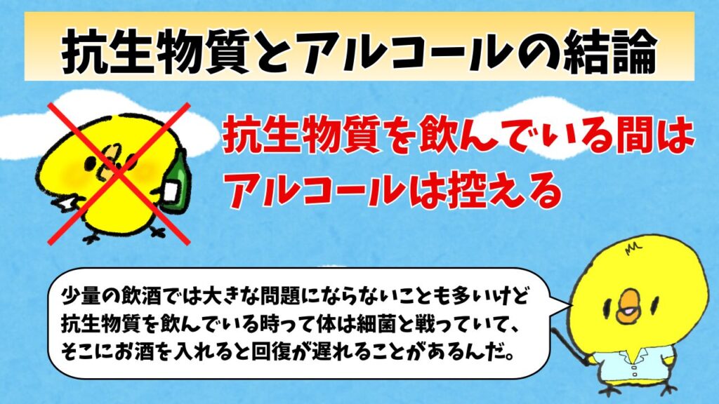 今回は抗生物質をアルコールの関係について話してきたよ。