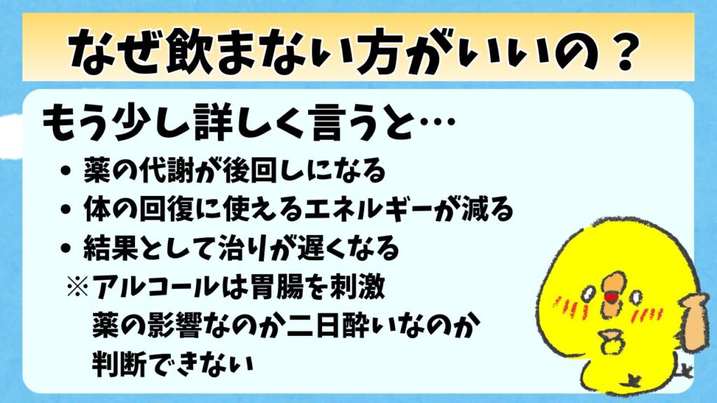 その状態でアルコールを入れると、回復の妨げになったり、余計な体調不良を招くことがあるんだ。