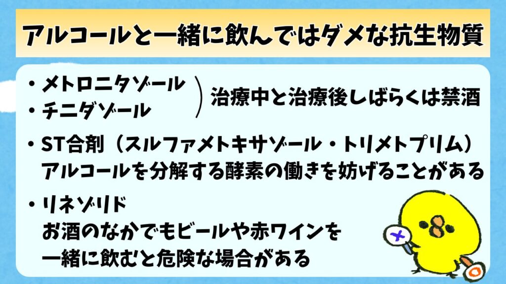それに、抗生物質の中にはアルコールと一緒に飲むと、はっきり体調が悪くなる薬もあるんだ。
