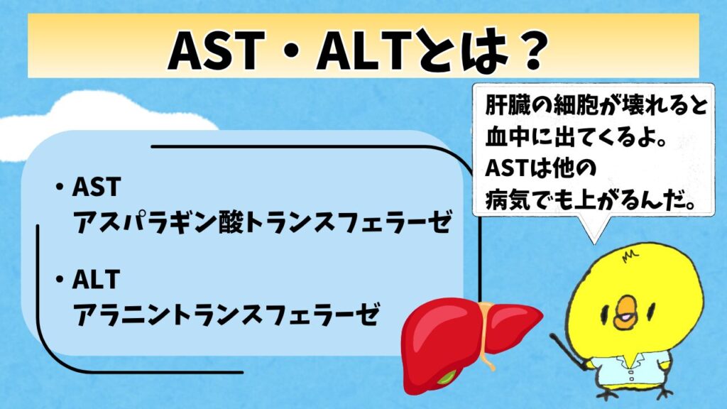 お姉さんが言っているように、ASTとALTは肝臓の病気を調べる時にみるものだね。