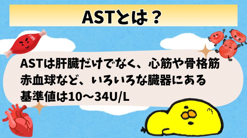 ASTは肝臓だけでなく、心筋や骨格筋、赤血球など、いろいろな臓器にあるんだよ。