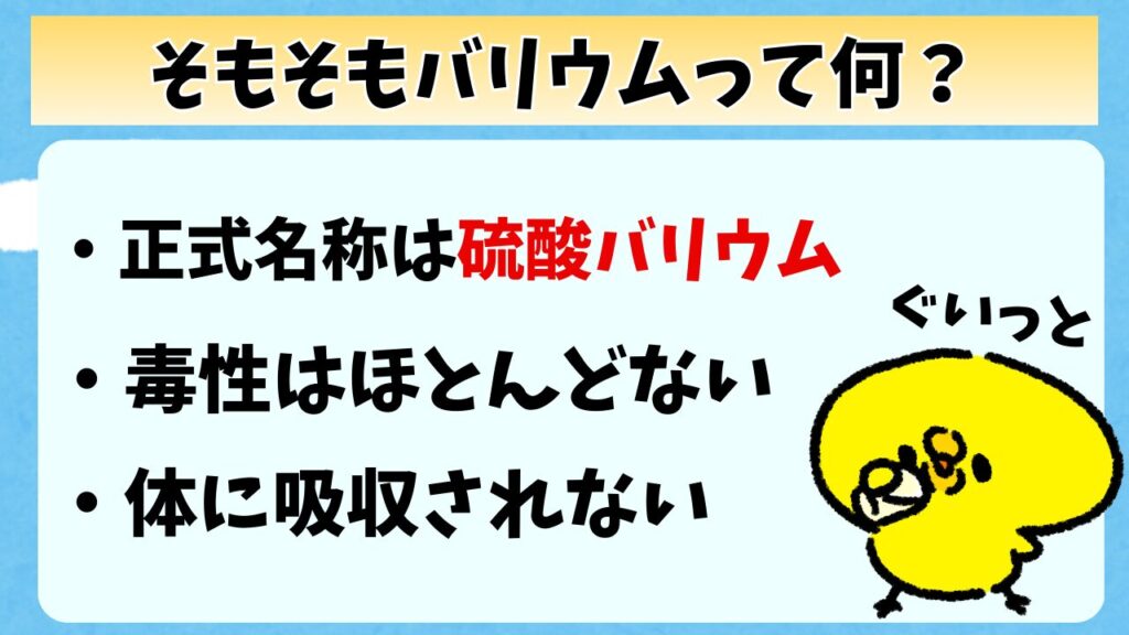 バリウムって名前を聞いたことがあったり、実際にバリウム検査をやったことがある人も多いと思うんだ。