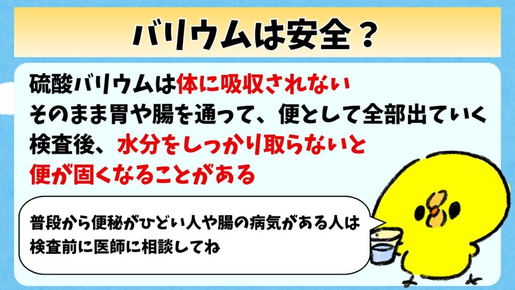 バリウムは水分を吸って固まりやすいから、検査後に水分をしっかり取らないと、便が硬くなってしまうことがあるんだ。