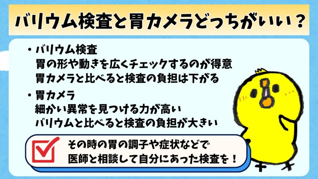 バリウム検査は胃の形や動きを広くチェックするのが得意なんだ。