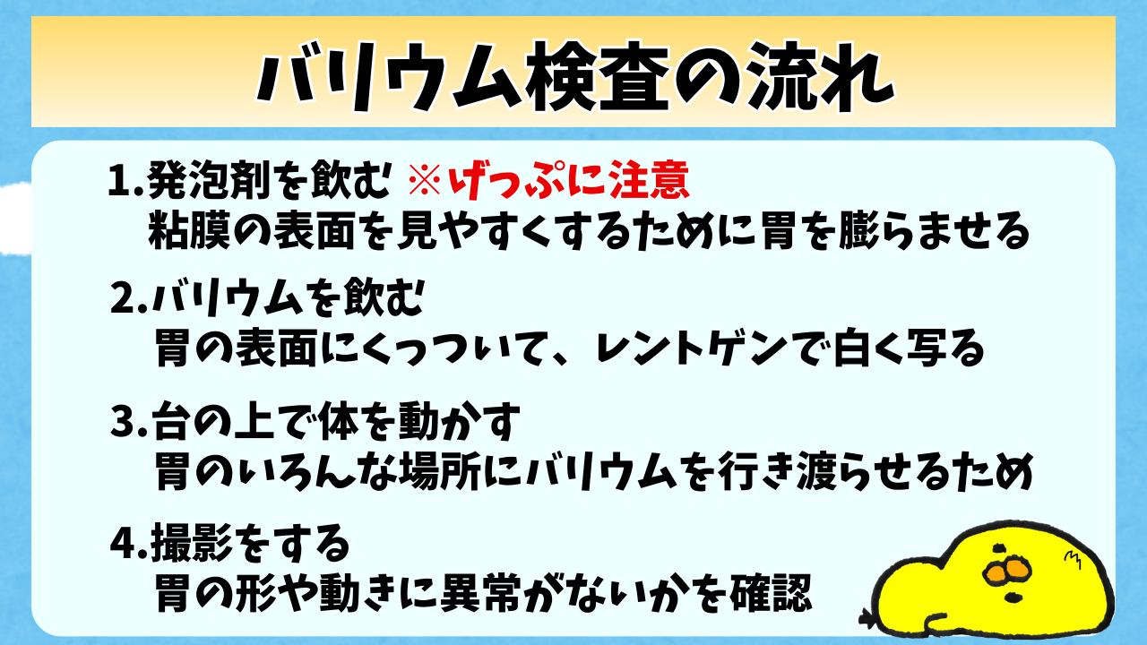 じゃあこのバリウム検査がどうやって行われるのかを簡単にまとめていくね。