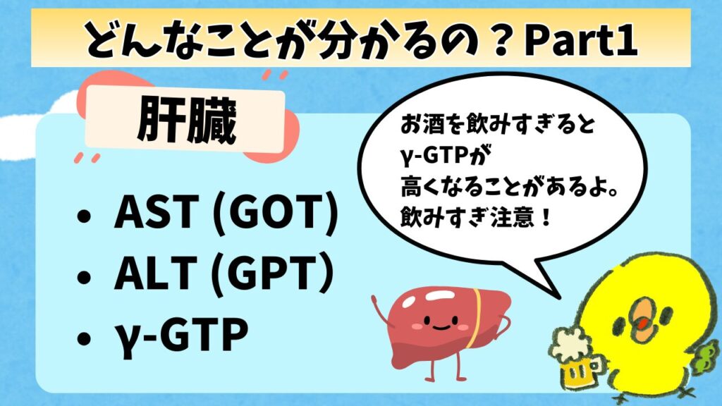 例えば、お酒を飲みすぎるとγ-GTPが高くなることがあるから、「ちょっと飲みすぎだよ!」って教えてくれるサインにもなるんだ。
