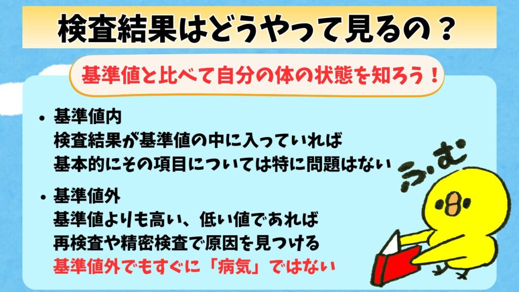 検査結果の用紙には、それぞれの項目ごとに「基準値」っていう目安の数値が書いてあるんだ。