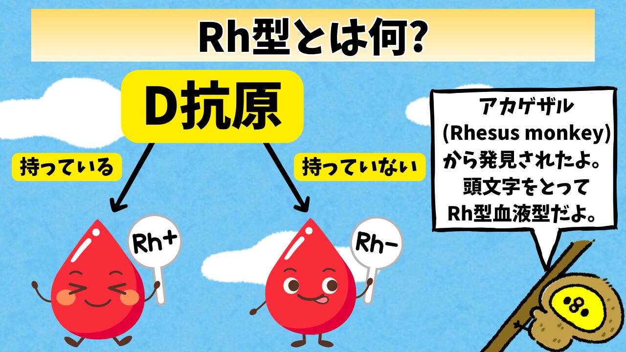 さっきもちょっと話したけど、Rh型は赤血球の表面にD抗原があるかどうかで決まる。
