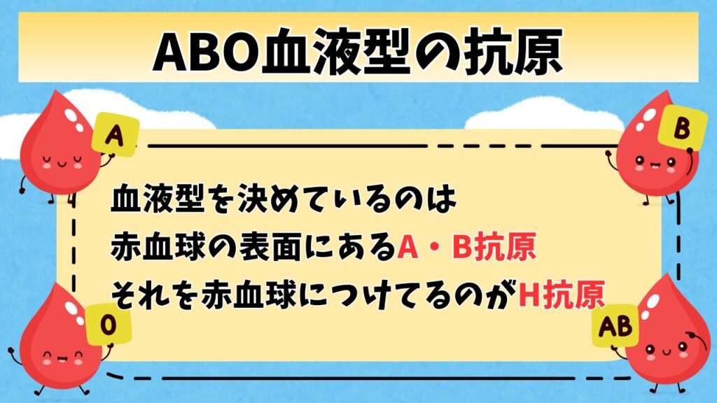このH抗原があるおかげでAやBの抗原が赤血球に付けられるんだ。