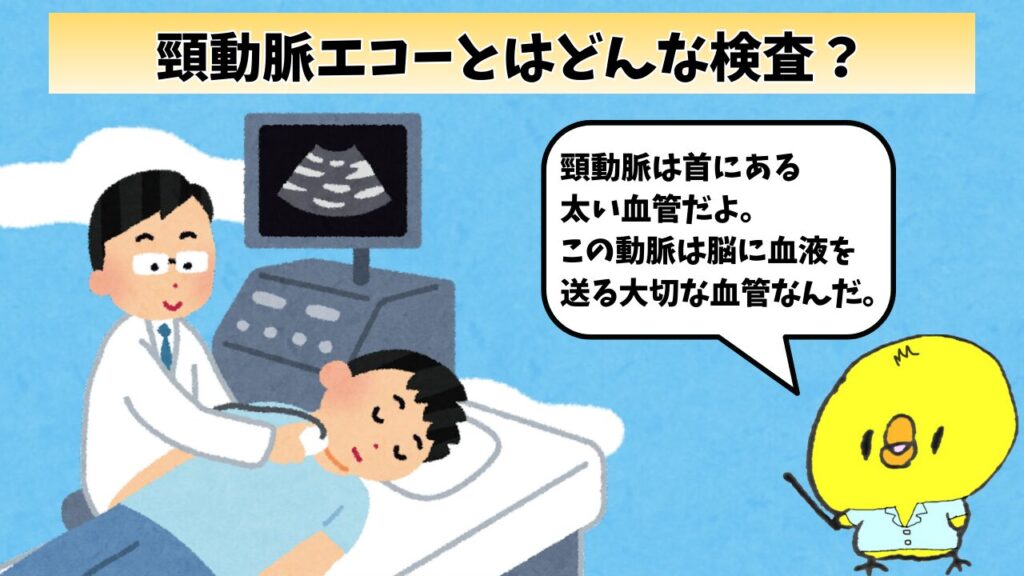 頸動脈エコーっていうのは、首にある「頸動脈」っていう太い血管を超音波で見る検査なんだよ。