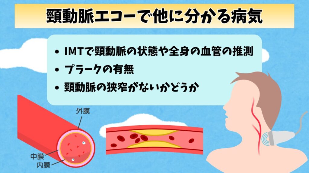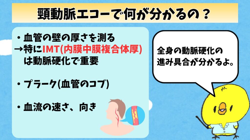 頸動脈はこの影響を受けやすいから、頸動脈エコーは動脈硬化を調べるのにとても役立つんだ。