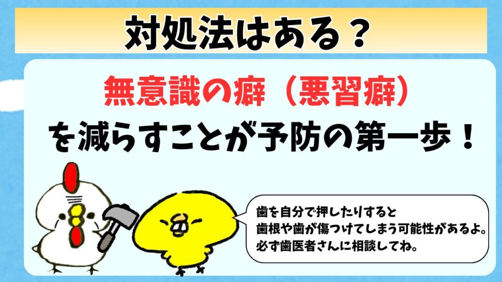 気になる人は癖を意識して改善しつつ、歯医者さんに相談して自分に合った方法でケアしていこうね。
