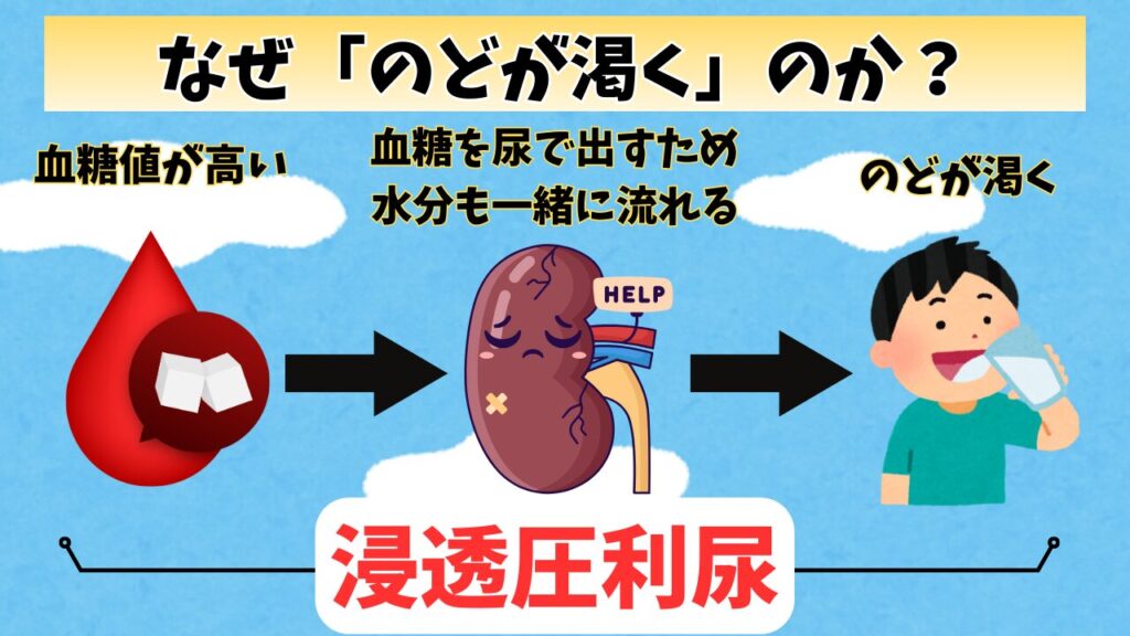 「高血糖 → 尿に糖が出る → 水分も一緒に失われる → 脱水気味 → のどが渇く」