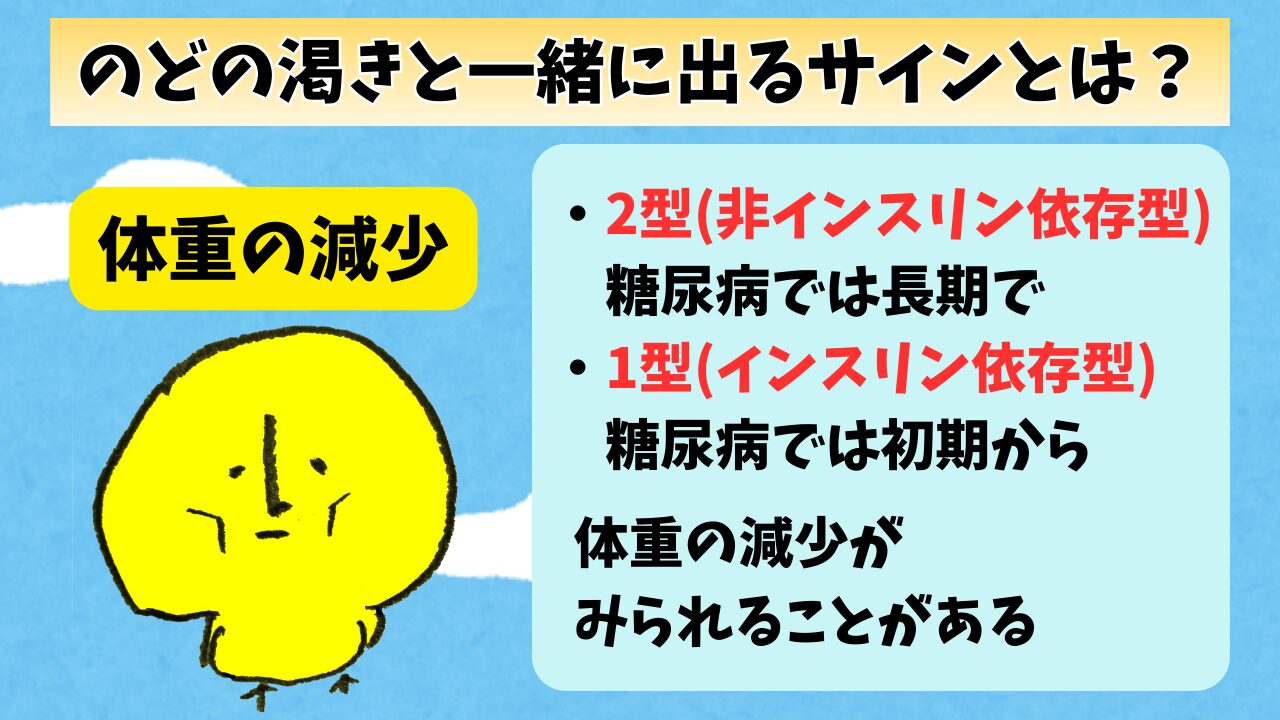 糖尿病でのどが渇くときって、だいたい他のサインもいっしょに出てくることが多いんだよ。