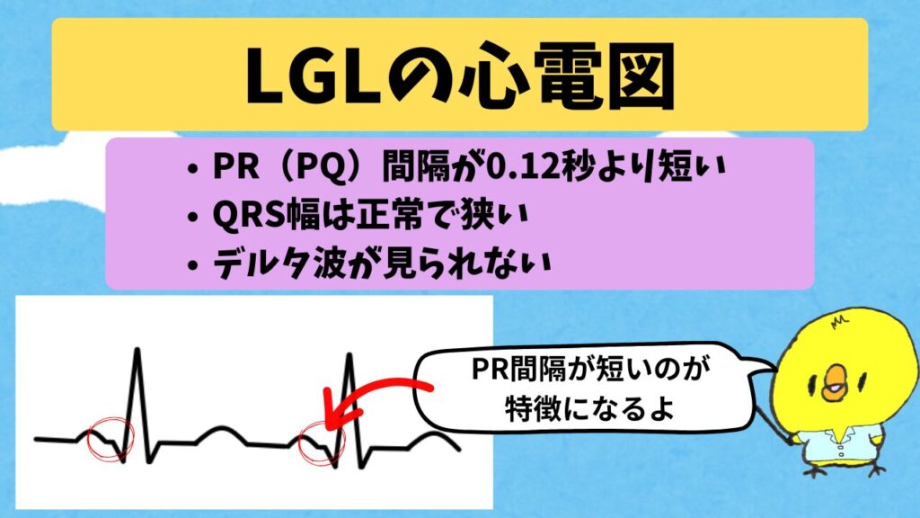 ・LGL症候群は、PR(PQ)間隔が短く、QRSは正常でデルタ波が出ない心電図所見を特徴とする
