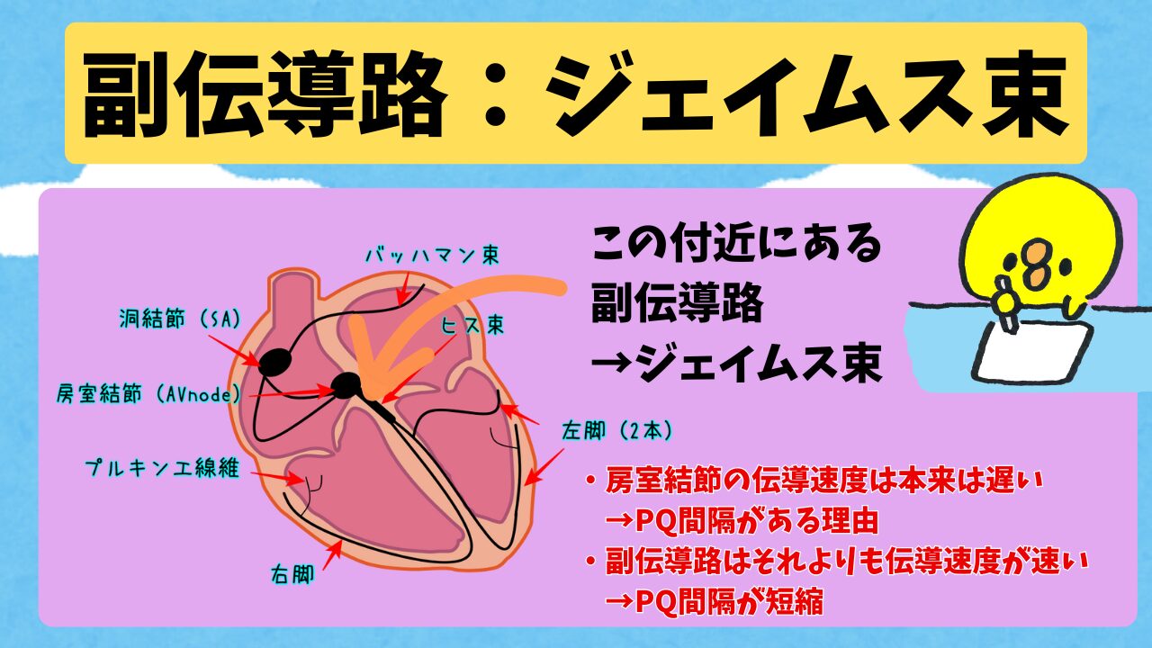 『房室結節の伝導よりも伝導速度が速い副伝導路(ジェイムス束)が存在している』