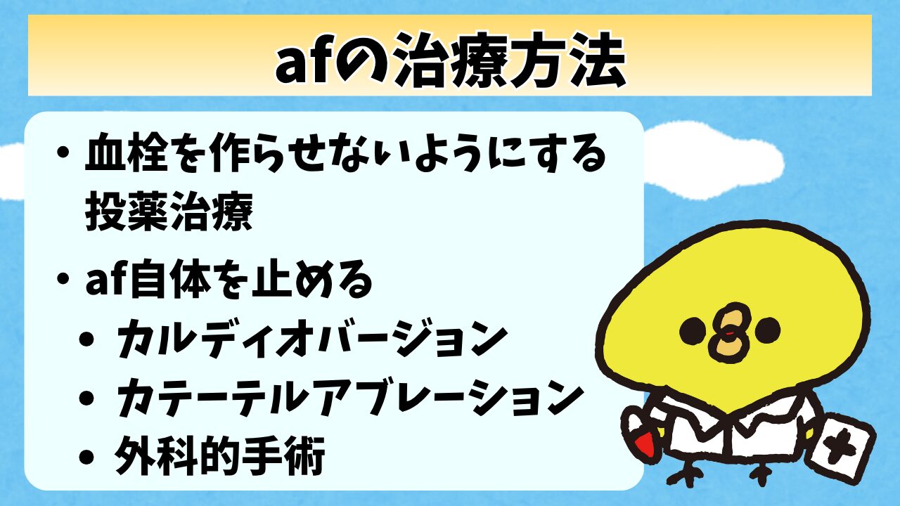 こうやって合併症を防ぐということが多いけど、af自体を止める治療もあるよ。