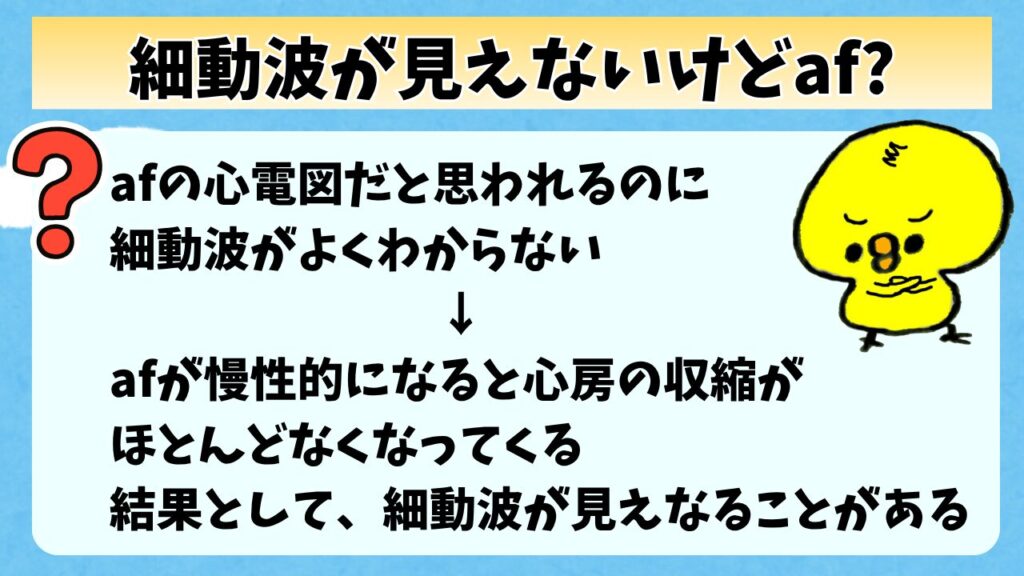 afの心電図だと思われるのに、細動波がよくわからないものがあるんだ。