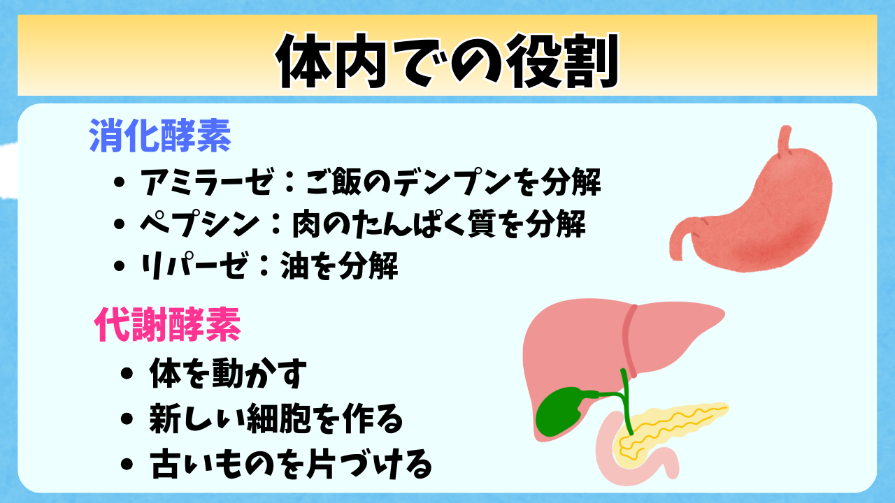 ・体内では主に消化酵素と代謝酵素が活躍していて食べ物を分解したりエネルギーを作ったりしている