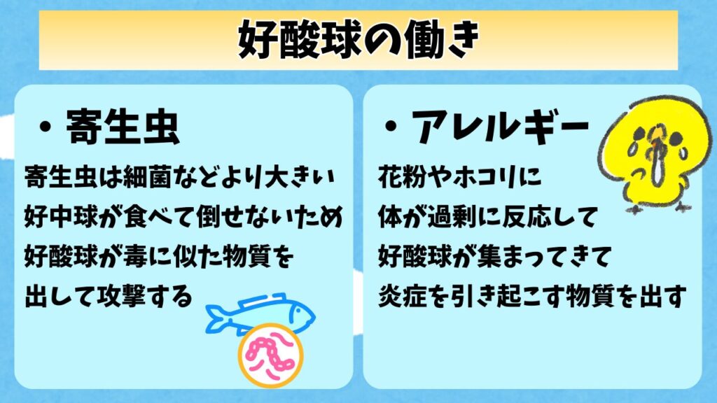 好酸球が多くなる理由は「アレルギー」と「寄生虫感染」なんだよ。
