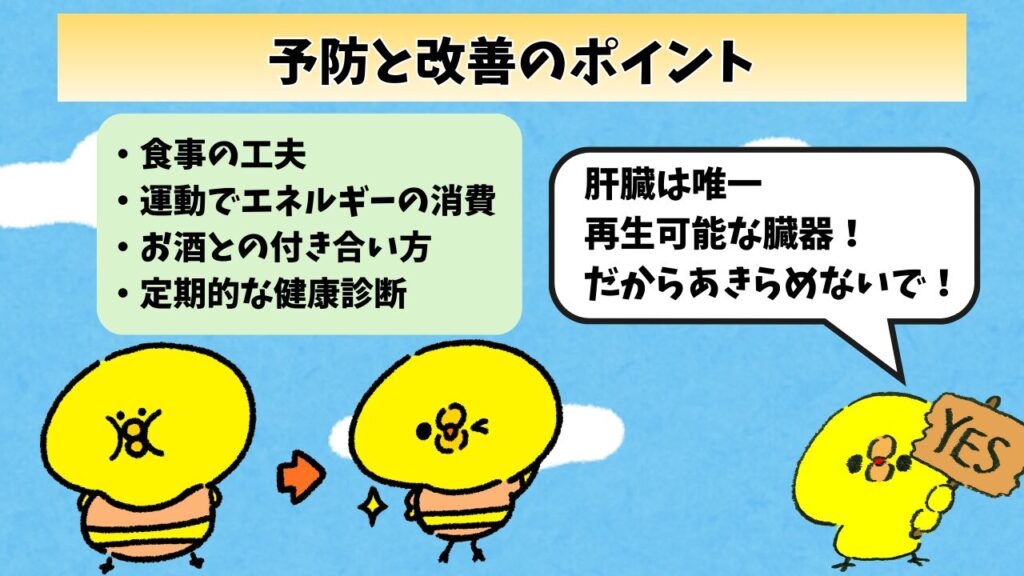 だから脂肪肝となってしまっても、適切な生活をしていれば改善に向かうんだよ。