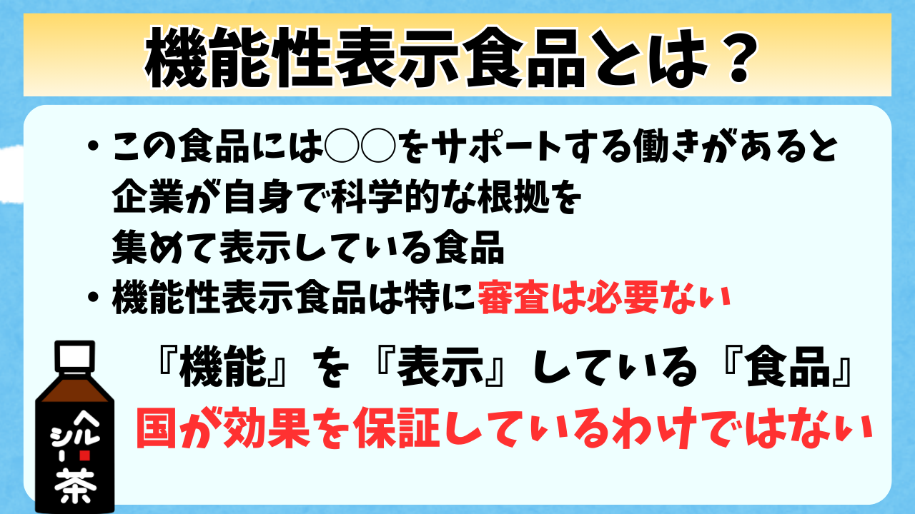 これは後でも話すけど、他にもトクホ(特定保健用食品)というものがあるけど、実はあれとは違うものになるんだ。