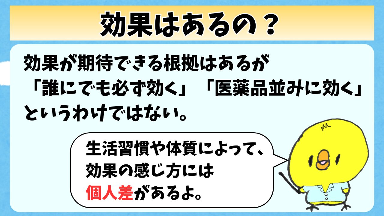 効果が期待できる根拠はあるけど、「誰にでも必ず効く」とか「医薬品並みに効く」ってわけではない。