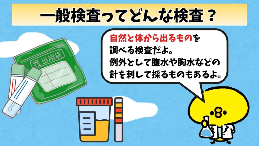 一般検査は、尿や便みたいに「自然に出るもの」を調べる方法になるよ。