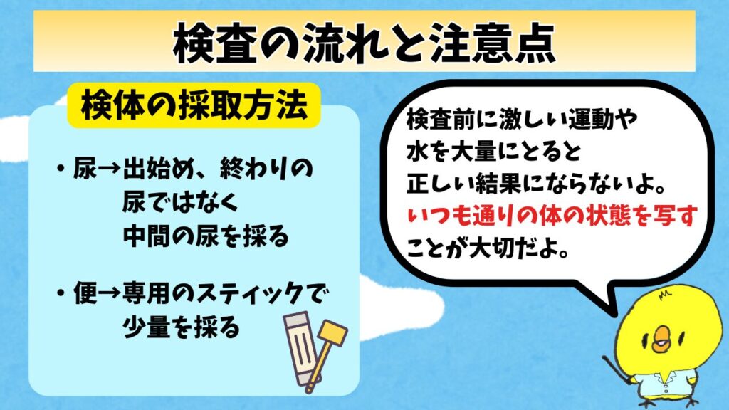 難しい名前に聞こえるけど、実は尿や便を調べたりするシンプルな検査になるよ。