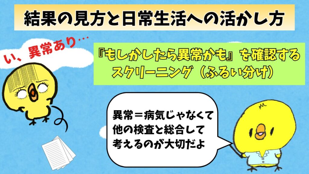 だから1回で慌てるんじゃなくて、再検査や他の検査と合わせて判断するのが大事なんだよ。