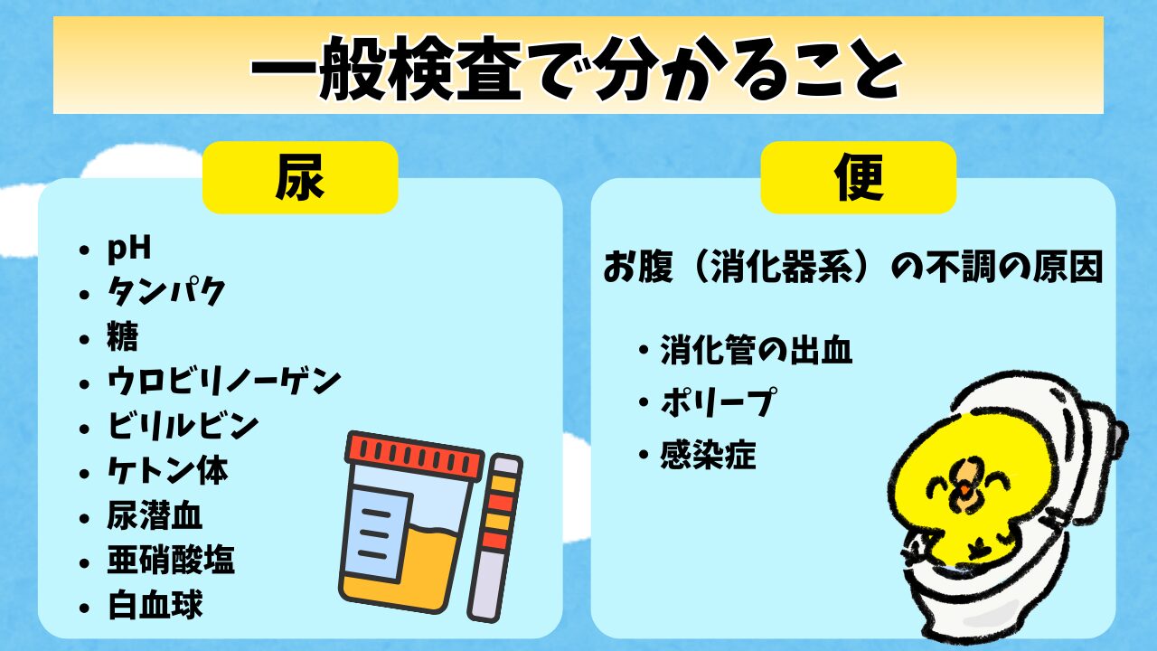 一般検査は、尿や便みたいに「自然に出るもの」を調べる方法になるよ。
