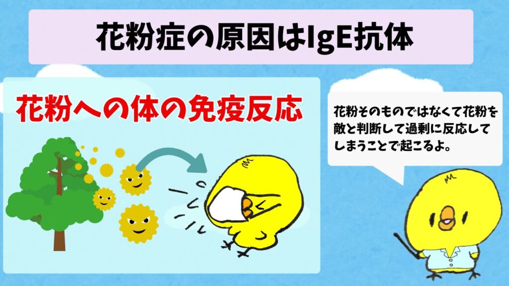 まず人は花粉に対抗するためのIgE抗体っていうものを作って準備するんだ。