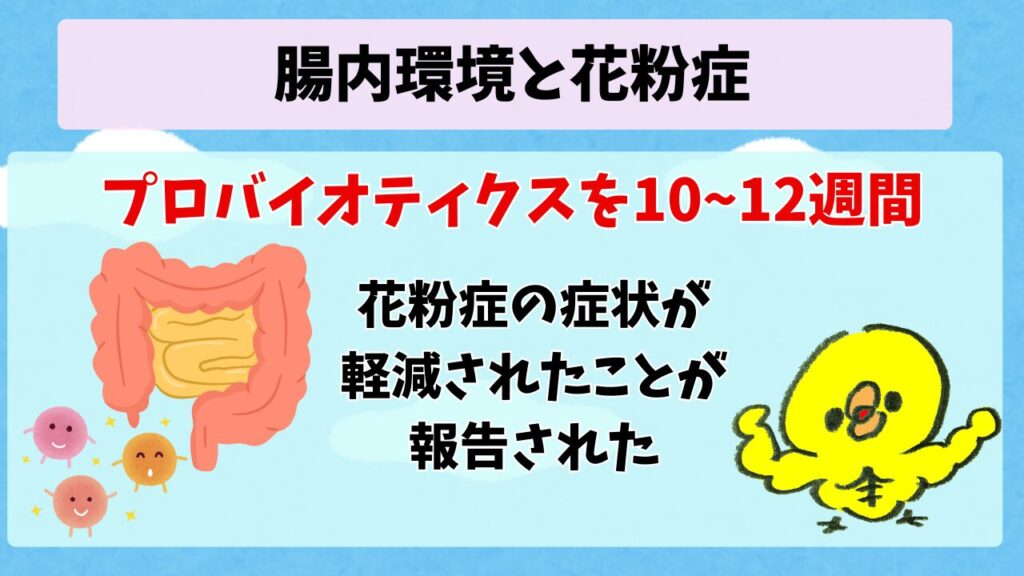 ・プロバイオティクスを長期間接種した人が花粉症の症状が軽減した報告がある