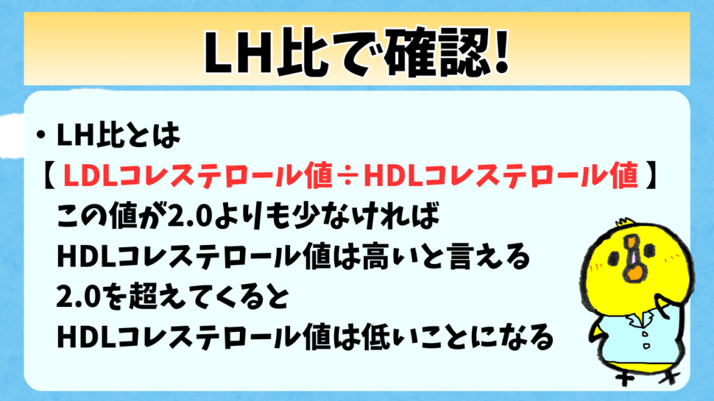 この値が2.0よりも少なければ、HDLコレステロール値は高いと言えるよ。