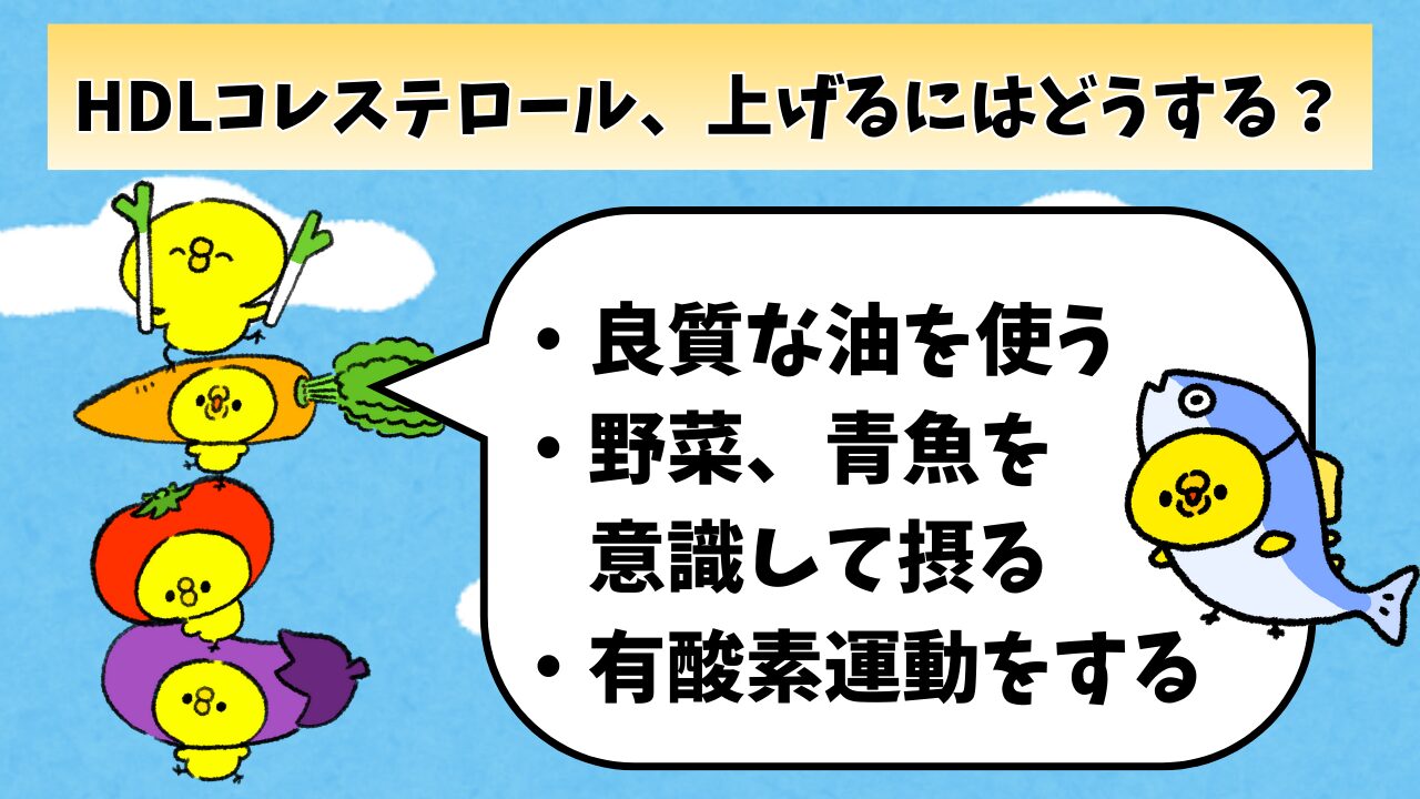 じゃあ次はこのHDLコレステロールの数値を上げるには、何をすればいいかって話をしていくね。