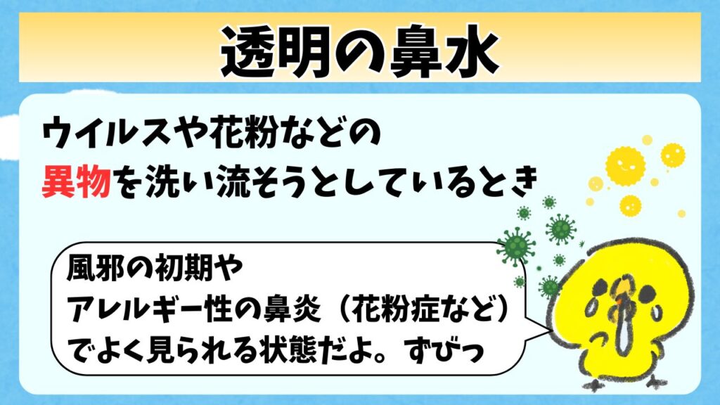 透明の鼻水は風邪の初期やアレルギー性の鼻炎(花粉症など)でよく見られる状態だね。