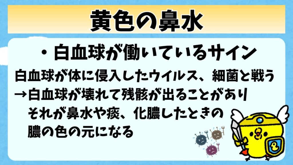 白血球がウイルスや細菌を退治する過程で、それらや白血球自身の一部が鼻水に混ざり、濁って黄色っぽく見えることがあるんだよ。