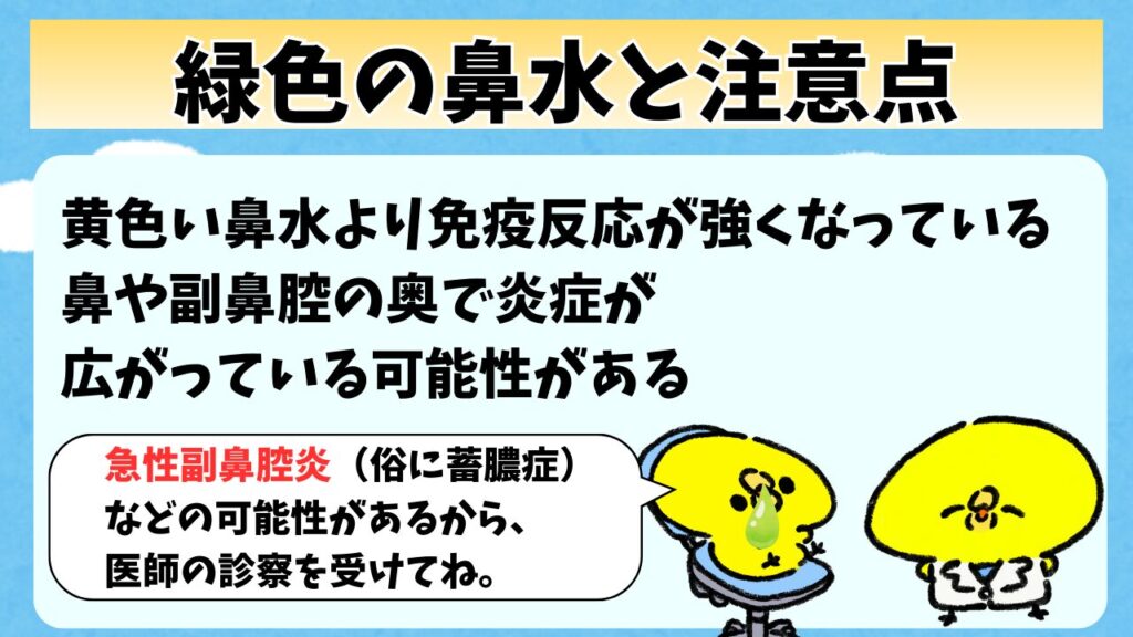 ・緑色の鼻水は炎症が進んでいる可能性があり、10日以上続いたり、頭痛や嗅覚の低下がある場合は耳鼻科の受診が必要