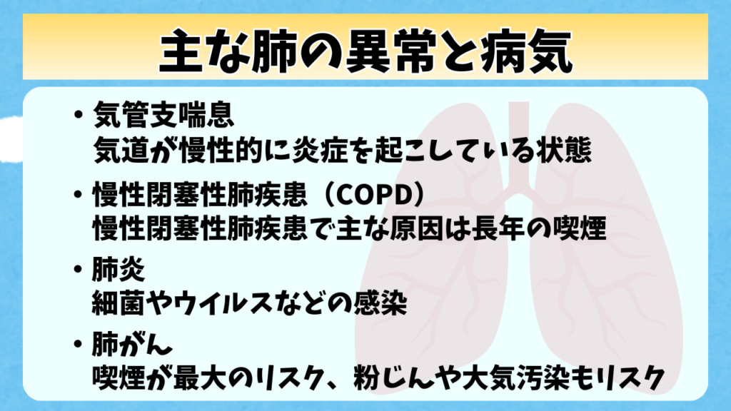 肺にはいろんな病気があるけど、ここでは代表的な病気についていくつか解説していくよ。