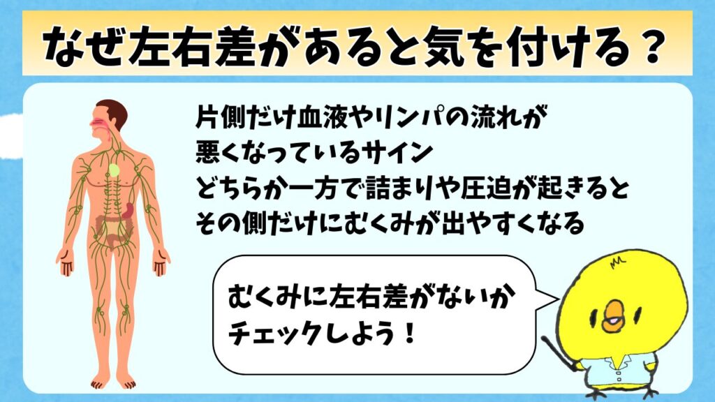 だから、どちらか一方で詰まりや圧迫が起きると、その側だけにむくみが出やすくなるんだよ。
