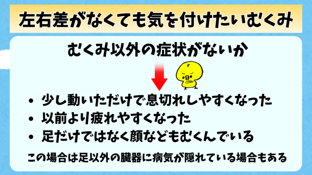 ・左右差がなくても、息切れや全身のむくみを伴う場合は内臓の病気が隠れていることがある