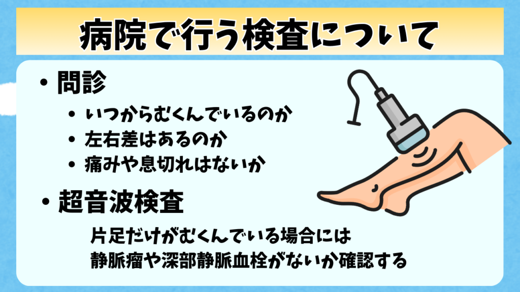特に片側の足だけがむくんでいる場合には、静脈瘤や深部静脈血栓症がないかを確認するのに超音波検査を行うことがあるよ。