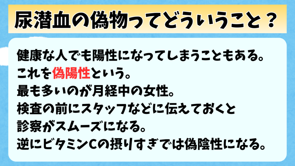 例えばビタミンCは摂りすぎると、そのビタミンCの作用によって偽陰性になることもあるんだよ。