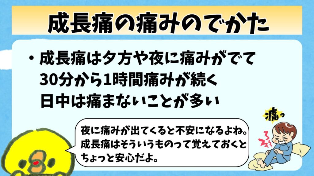 成長痛の場合は夕方や夜に痛みがでて30分から1時間痛みが続くんだ。