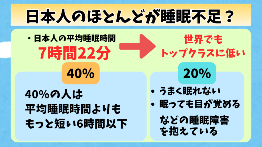 統計によると、日本人の平均睡眠時間は7時間22分だと発表されている。