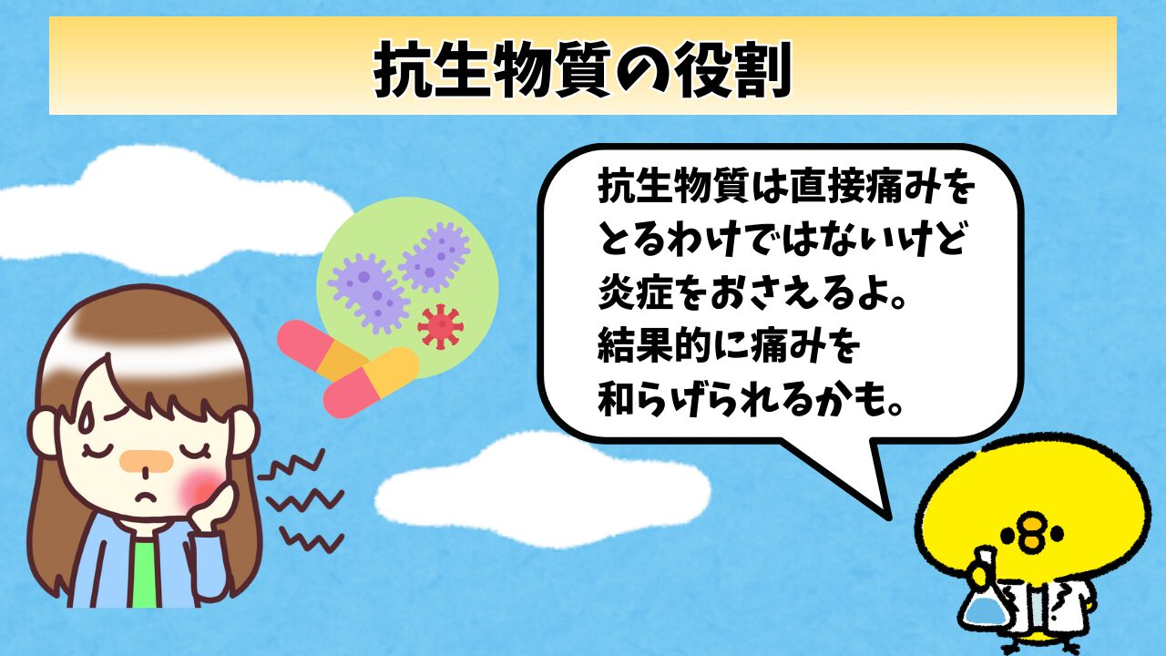 抗生物質は直接痛みを取る薬じゃないけど、炎症を小さくすることで痛み弱くするサポートをしてくれるってことだね。