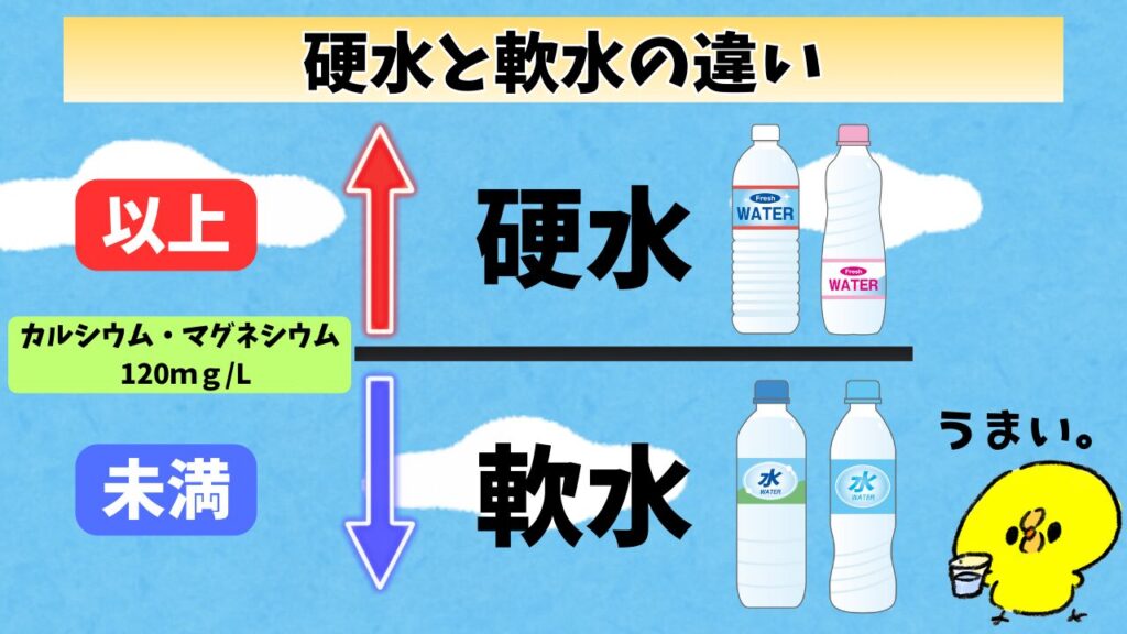 違いは、水の中に含まれるカルシウムやマグネシウムの量なんだ。