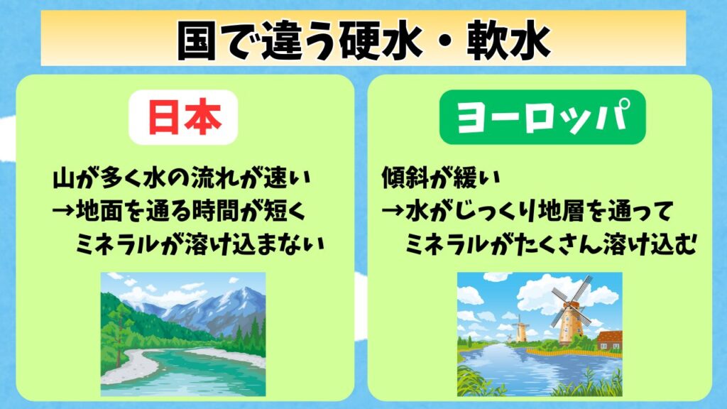 - 火山灰や花崗岩が多い土地 → ミネラルがあまり溶けない → 軟水になりやすい